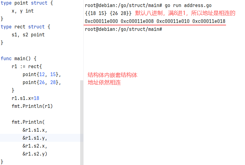 注意:在Go语言中,结构体是值类型,直接指向数据空间(并没有先指向一个地址,再通过地址指向数据空间)