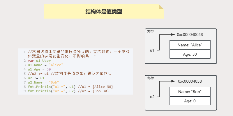 4、不同结构体变量的字段是独立的,互不影响,一个结构体变量的字段发生变化,不影响另一个,结构体是值类型,比如: