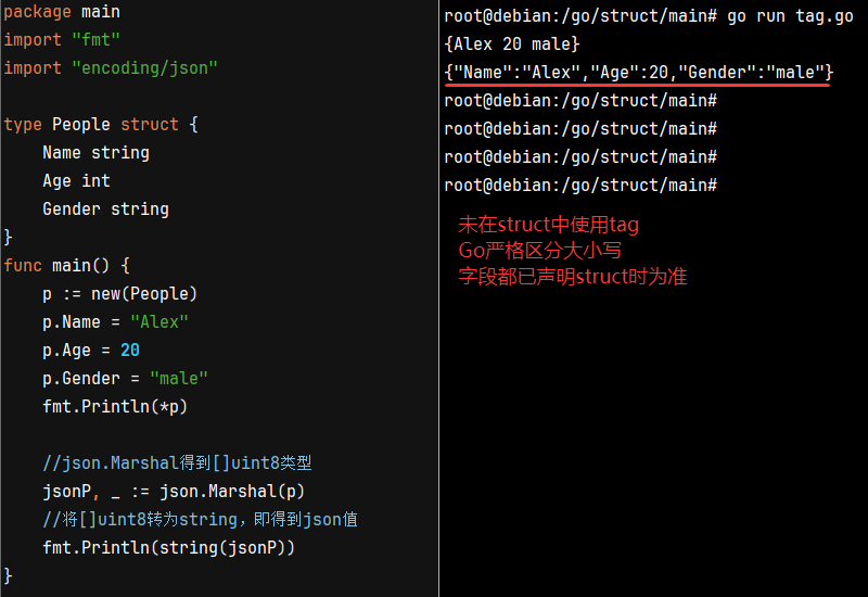 下面是没有使用tag时的案例,struct转json后,字段首字母依然大写:
