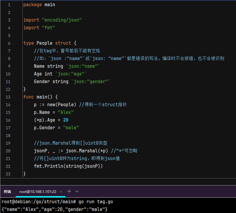 4、struct的每个字段后面,可以加上一个tag,这个tag可以通过反射机制获取,常见的使用场景是序列化和反序列化(json)