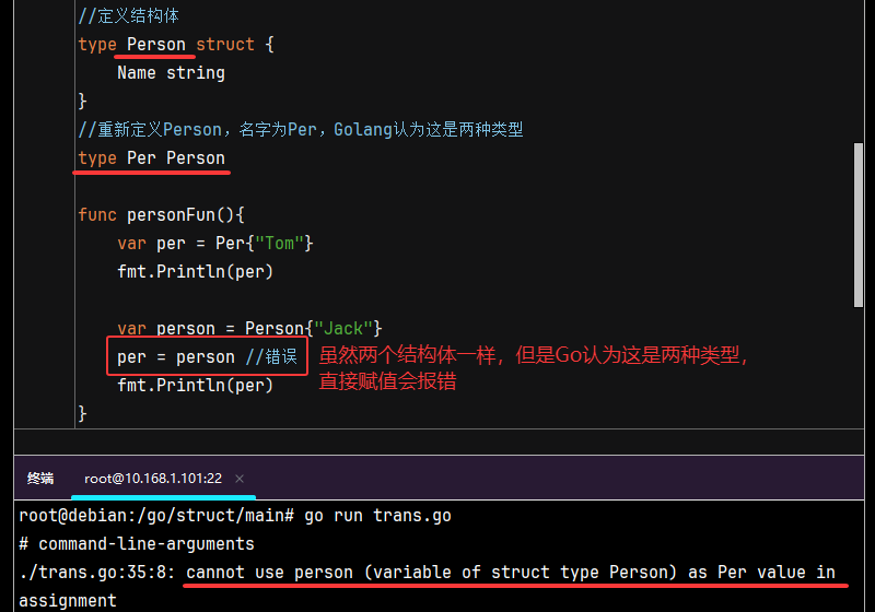 2、结构体是用户单独定义的类型,和其它类型(结构体)进行转换时,需要有完全相同的字段(名字、个数、类型)
