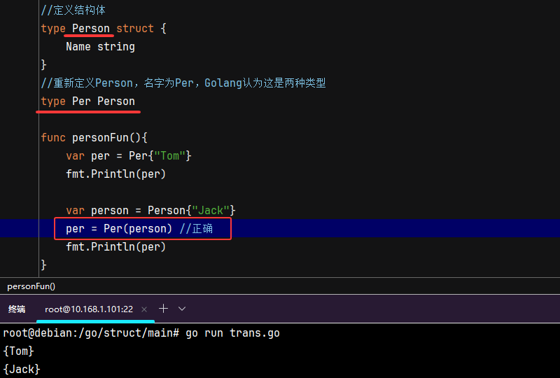 3、当我们定义好一个结构体后,再次使用type进行重新定义,Golang认为这是新的数据类型,新旧两种类型的变量之间可以相互强转