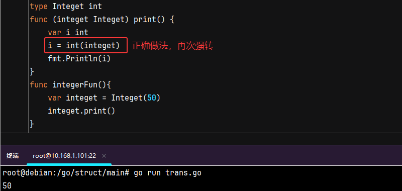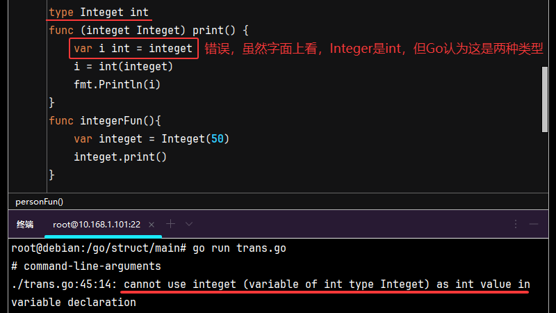 再举个例子,比如把int类型重新定义为integer后,Go认为这是两种类型
