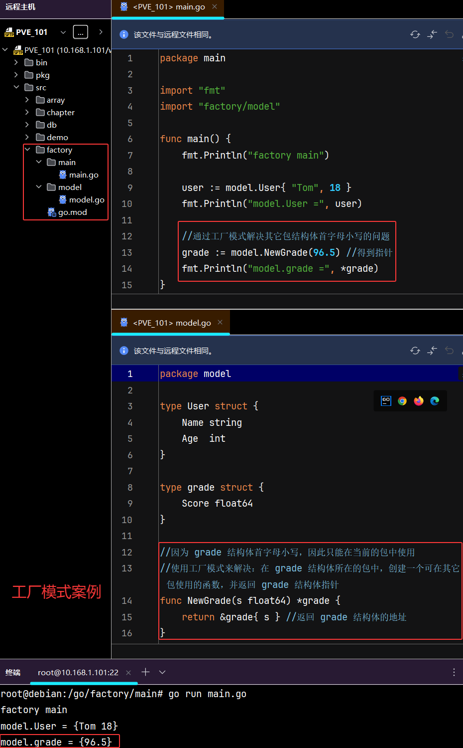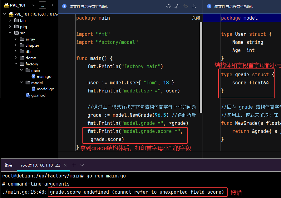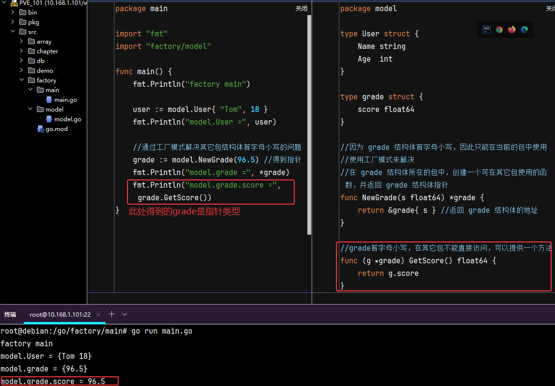 上面的案例中,虽然 grade 结构体的首字母小写,但其中的字段 Score 首字母为大写,所以在其它包中,只要通过工厂模式得到 grade 结构体,即可使用 Score 字段