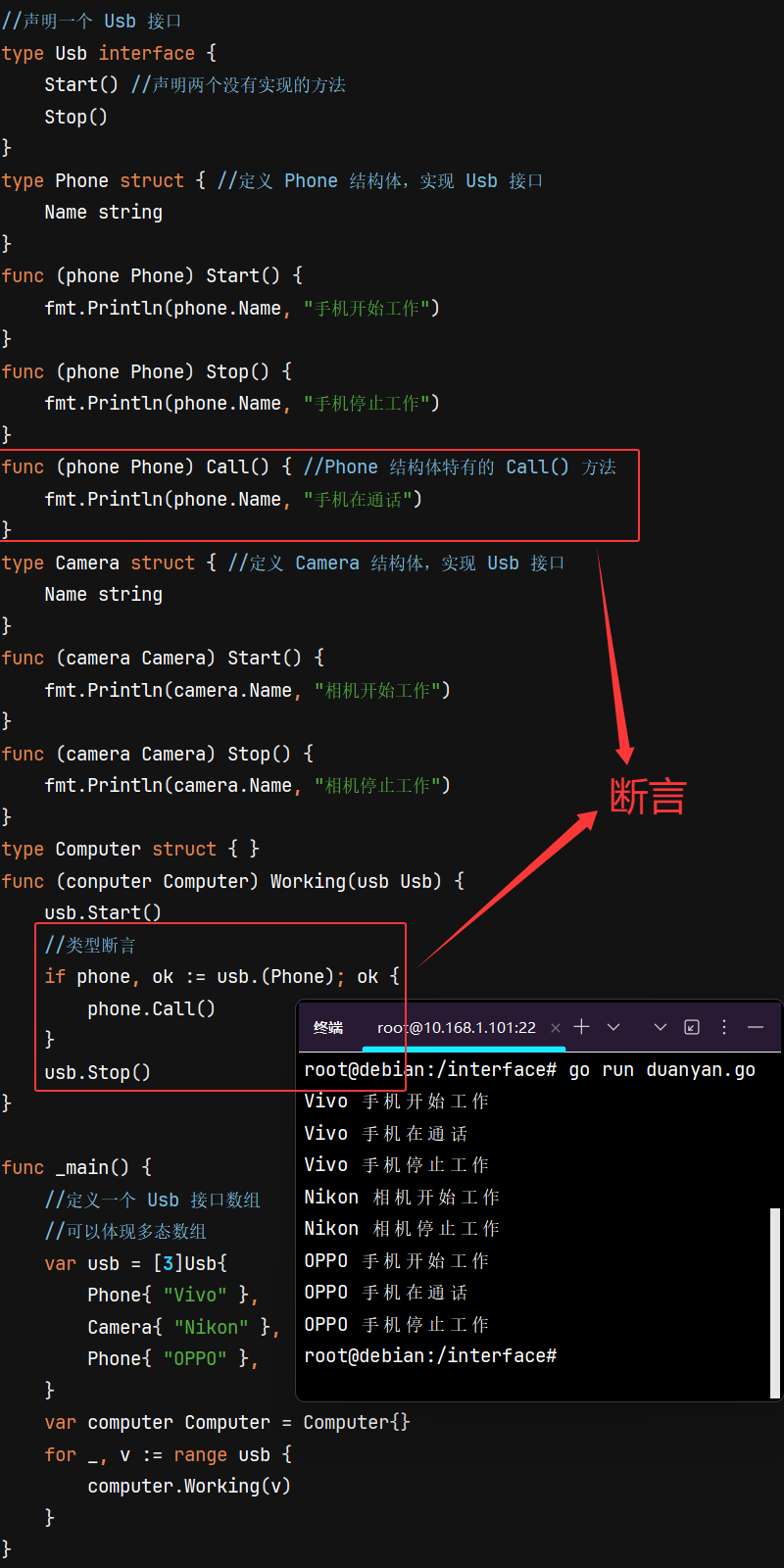 ⑵. 有 Phone 和 Camera 两个结构体实现了 Usb 接口,但 Phone 结构体还有一个特有的方法 Call()