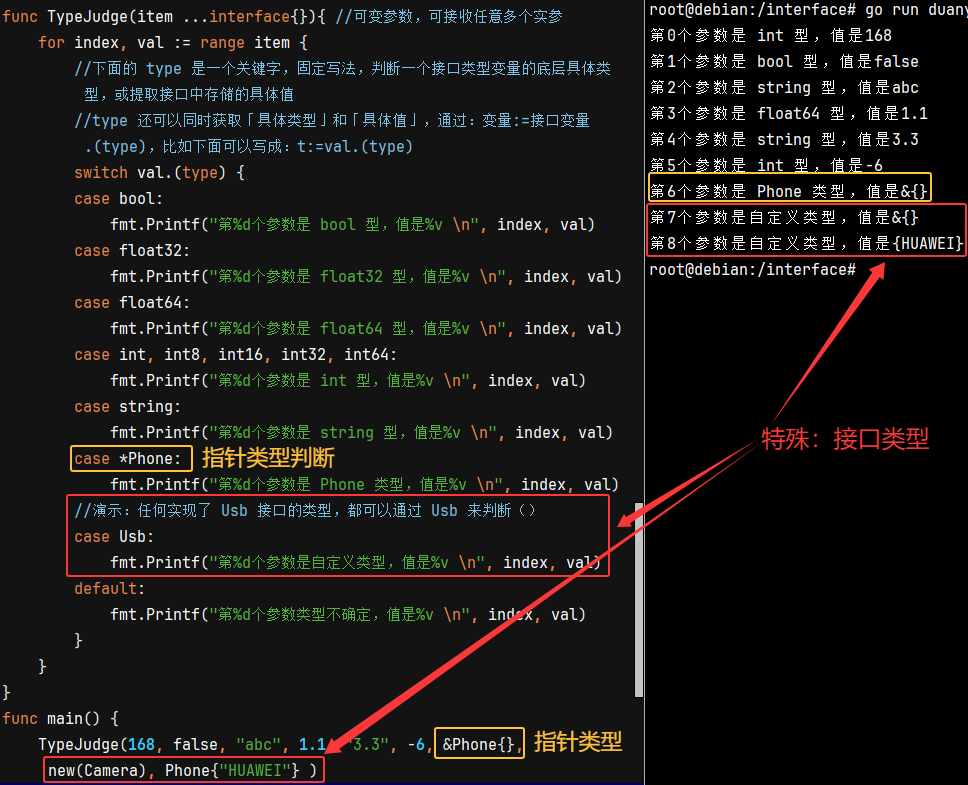 注意以上案例已说明,结构体和结构体指针等自定义类型,都可以用接口类型来判断,前提是已经实现了这个接口