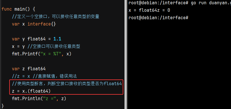 类型断言:由于接口是一般类型,不知道具体类型,如果要转成具体类型,就需要使用类型断言