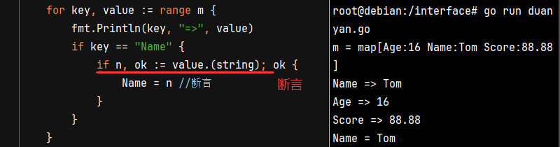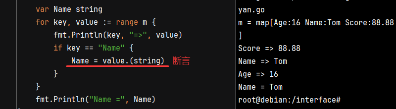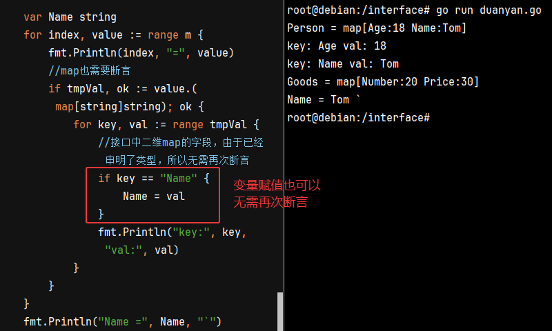 将map中字段的值赋给其它变量,同样无需再次断言(前提必须明确声明字段的类型)