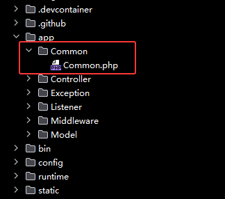 1、创建函数文件,在项目根目录的app目录中,创建 Common文件夹(和Controller文件夹同级),在 Common 文件夹内创建 Common.php 文件,也可以直接在 app 目录下创建任意名字的文件,这里只是举例
