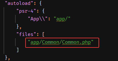 2、打开 composer.json 文件,找到 aotoload 下的 files,填入刚才创建的 Connom.php 文件路径