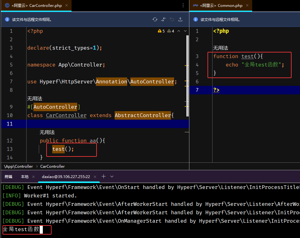 4、启动hyperf,在 Connon.php 文件中添加全局函数,在任意控制器中测试使用