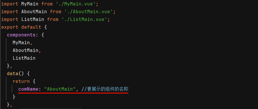 ① 定义路由组件:在 RouterMain.vue 中,导入 MyMai.vue、AboutMain.vue、ListMain.vue 三个组件,通过 data() 设置变量 comName,变量的值是要展示的组件名称