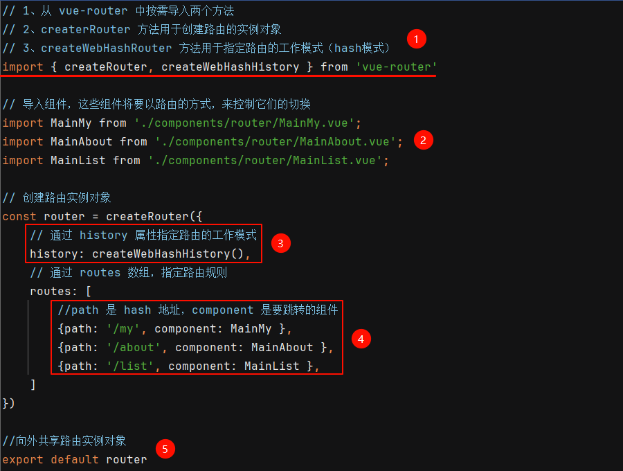 ② 编辑 router.js 文件,从 vue-router 中按需导入 createRouter 和 createWebHashHistory 两个方法,并做如下配置: