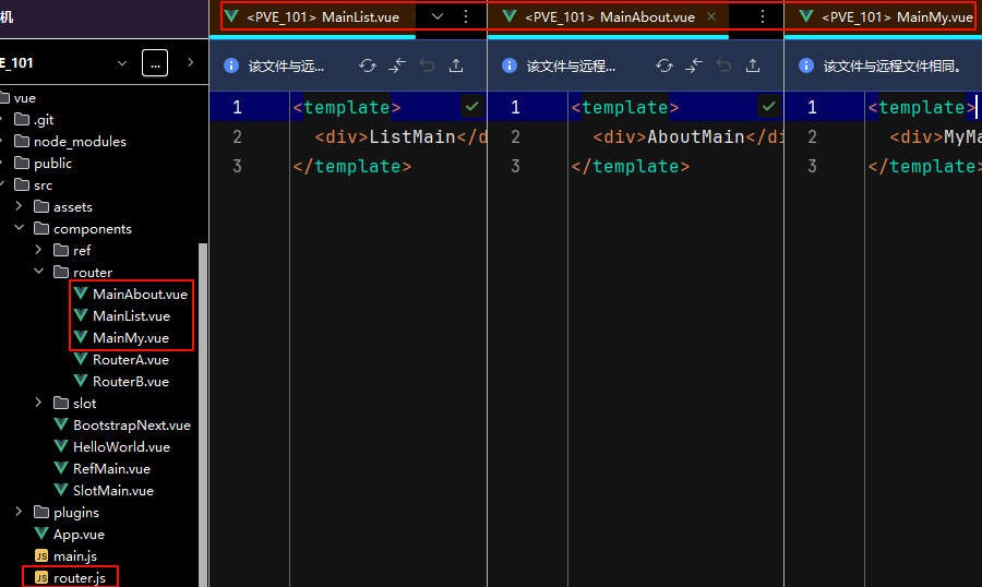 ① 创建组件:在项目中定义 MainMy.vue、MainAbout.vue、MainList.vue 三个组件,后面将使用 vue-router 控制他们的展示与切换