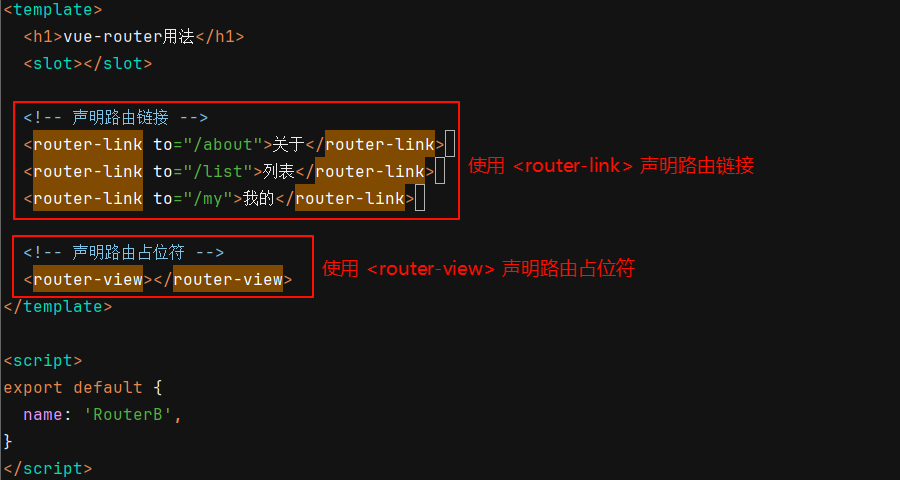 ② 声明路由链接和占位符:router-link 和 router-view 是 vue 提供的两个组件,使用 <router-link> 标签来声明路由链接,使用 <router-view> 标签来声明路由占位符