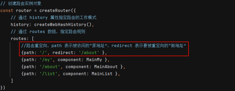 ③ 在嵌套路由中使用路由重定向:默认情况下,不会展示某个被嵌套的子路由(对应的组件),当希望打开某个页面时,能立即显示某个被嵌套的子组件,这时需要在嵌套路由中使用路由重定向(在路由规则中添加redirect属性)