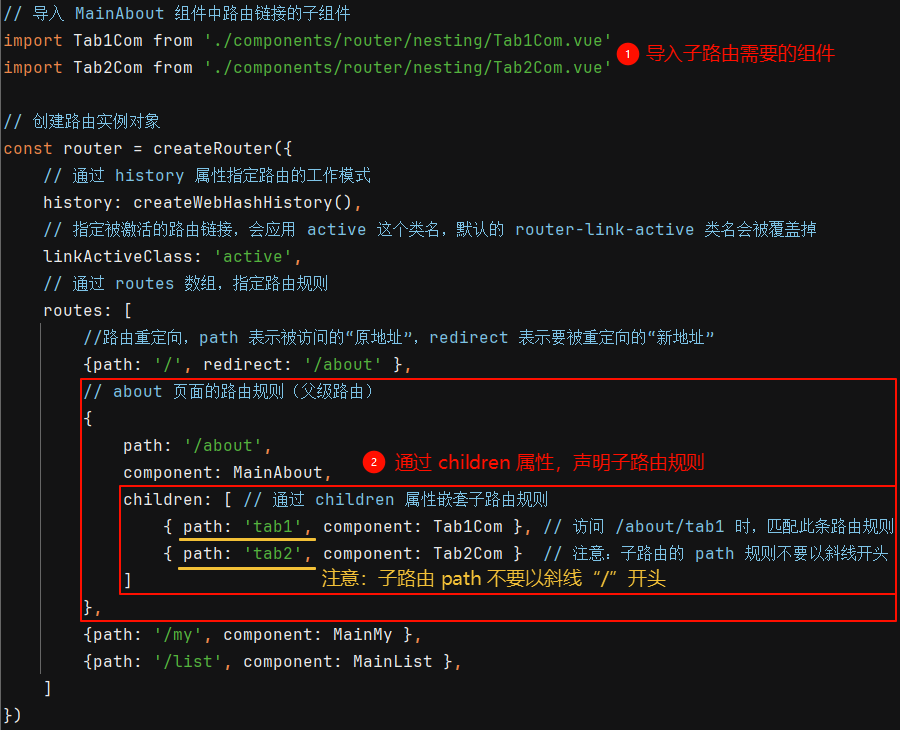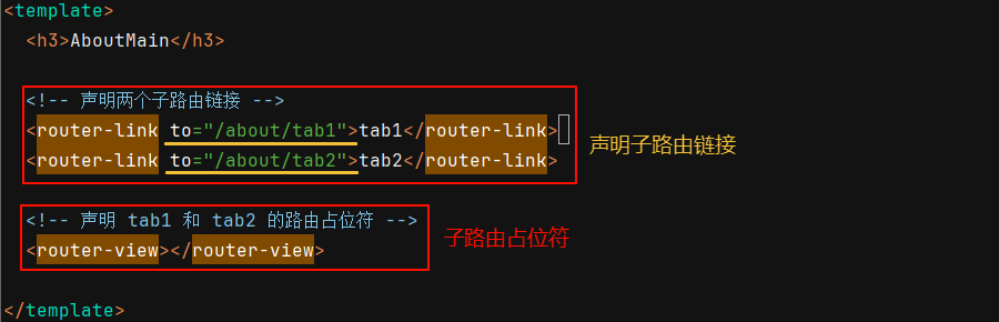 ① 声明子路由链接和子路由占位符:在子组件 MainAbout.vue 中,声明 tab1 和 tab2 的子路由链接以及子路由占位符(tab1 和 tab2 分被对应已经创建好的组件)