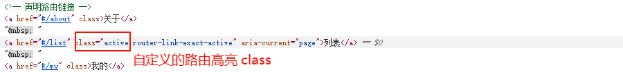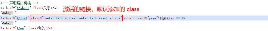 打开浏览器可以看到激活的路由链接 class 已变成自定义的名称