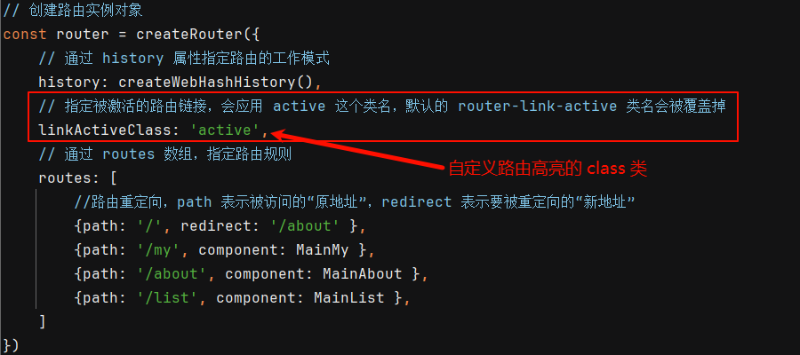 在创建路由的实例对象时,开发者可以基于 linkActiveClass 属性,自定义路由链接被激活时所应用的类名,打开路由模块 router.js 文件,添加以下配置: