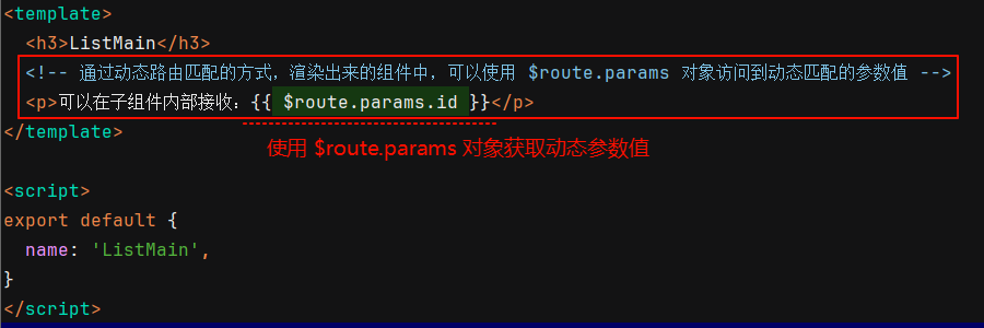 ② 在通过动态路由匹配方式渲染出来的组件中,可以使用 $route.params 对象访问到动态匹配的参数值