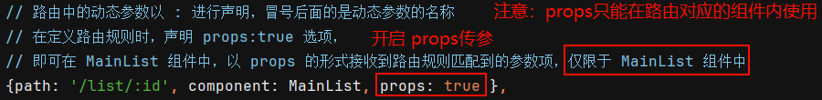 ③ 使用 props 接收路由参数:为了简化路由参数的获取形式,vue-router 允许在路由规则中开启 props 传参,具体操作如下: