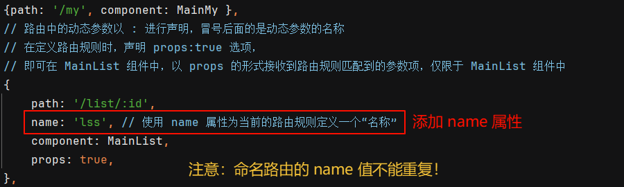 ① 定义命名路由:打开 router.js 路由模块,在路由规则中添加 name 属性,注意:命名路由的 name 值不能重复,必须保证唯一性。