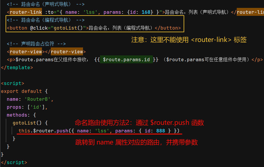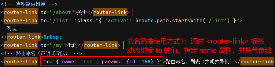② 使用命名路由实现声明式导航:为 <router-link> 标签动态绑定 to 属性的值,并通过 name 属性指定要跳转到的路由规则。还可以增加 params 属性指定要携带的路由参数: