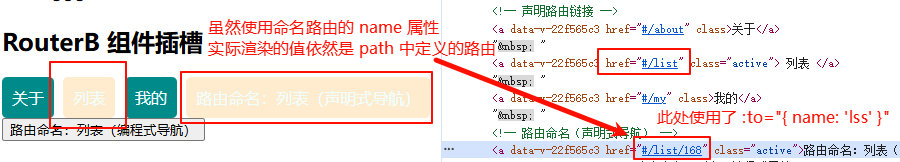 注意:即使用了路由命名的 name 属性,实际渲染依然是路由模块中 path 对应的值