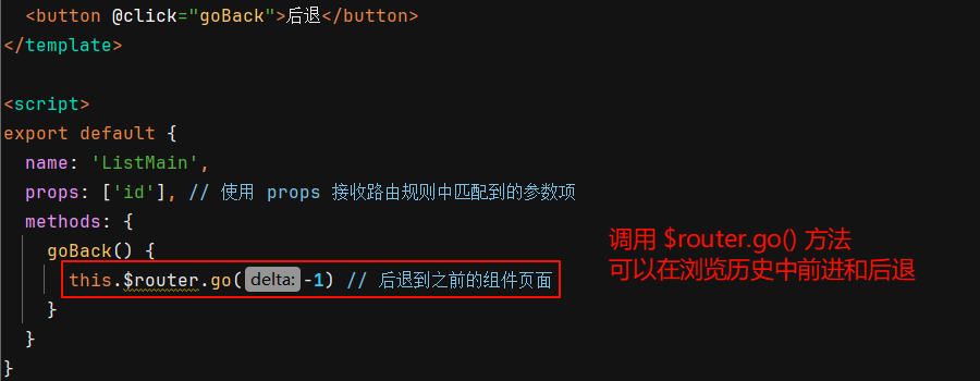③ 调用 $router.go() 方法,可以在浏览历史中进行前进和后退