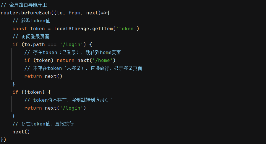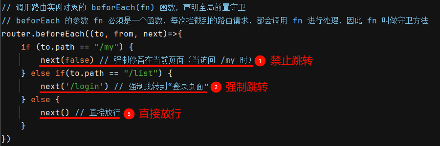 ② 声明导航守卫:全局导航守卫会拦截每个路由规则,从而对每个路由进行访问权限的控制。打开 router.js 路由模块,添加 router.beforeEach 方法就可以声明一个全局的导航守卫,如下所示