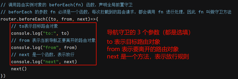 ③ 守卫方法的参数:全局导航守卫的守卫方法可以接收 3 个形参(可选),分别是: