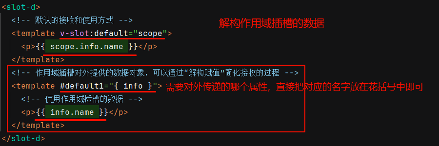 作用域插槽对外提供的是一个对象数据,外面使用时,接收到的也是一个对象,里面包含了插槽通过属性绑定方式对外提供的所有数据,访问某个数据时,需要通过接收到的对象依次往下访问。