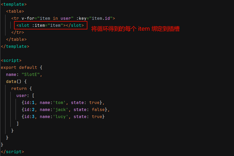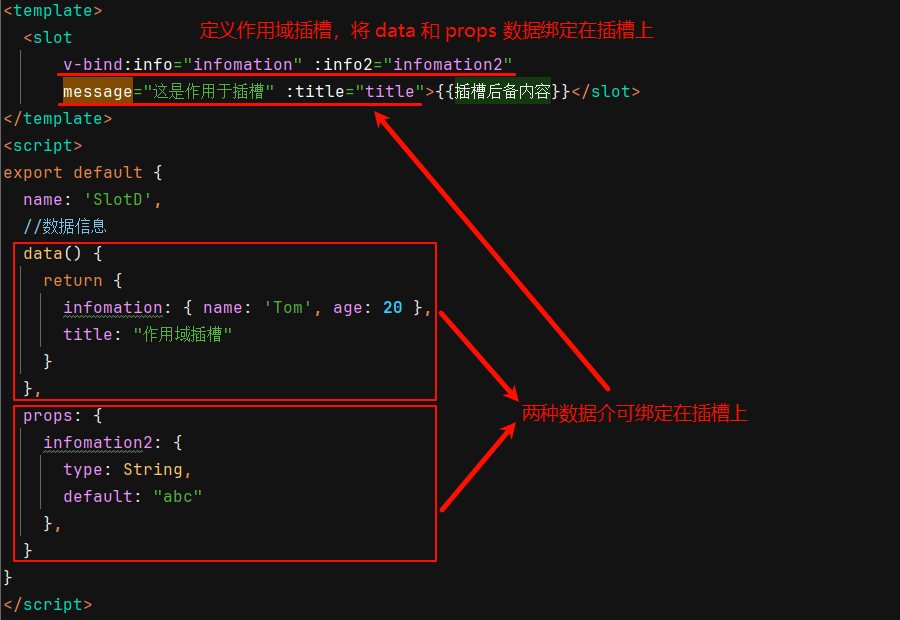 通俗理解,作用域插槽可以动态绑定数据,组件中 data 节点和 props 节点中的数据都可以绑定到插槽上。