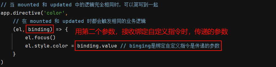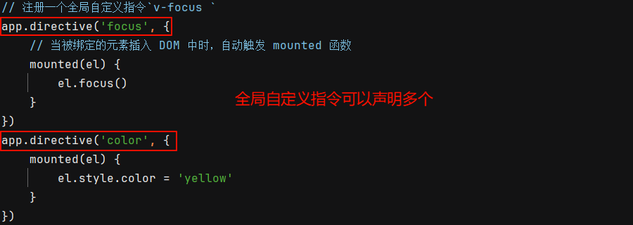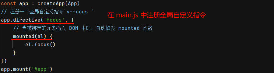 全局共享的自定义指令需要通过“单页面应用程序的实例对象”进行声明,在 main.js 入口文件中,拿到 app 应用实例后,调用这个实例所提供的 directive 方法,它可以接收两个参数,一个是自定义指令名称,一个是配置对象,根组件挂载到 DOM 且所有子组件挂载完成后自动触发mounted方法。