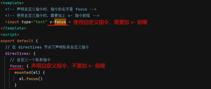 如上图所示,定义了一个名字为 focus 的自定义指令,功能是让使用的标签产生聚焦行为,在使用自定义指令时,需要加上 v- 前缀,示例代码如下: