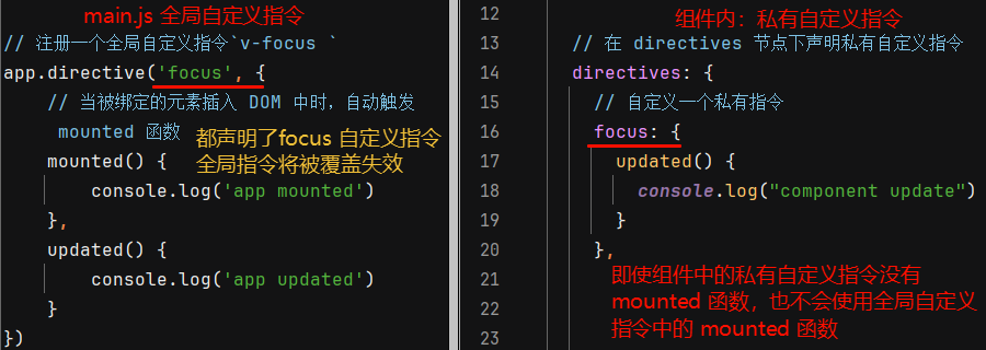当私有自定义指令和全局自定义指令名称相同时,全局自定义指令将被覆盖,无论自定义指令中的函数是否相同(比如全局使用了 mounted 方法,私有使用了 updated 方法),全局自定义指令都将失效。