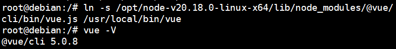 ln -s /opt/node-v20.18.0-linux-x64/lib/node_modules/@vue/cli/bin/vue.js /usr/bin/vue